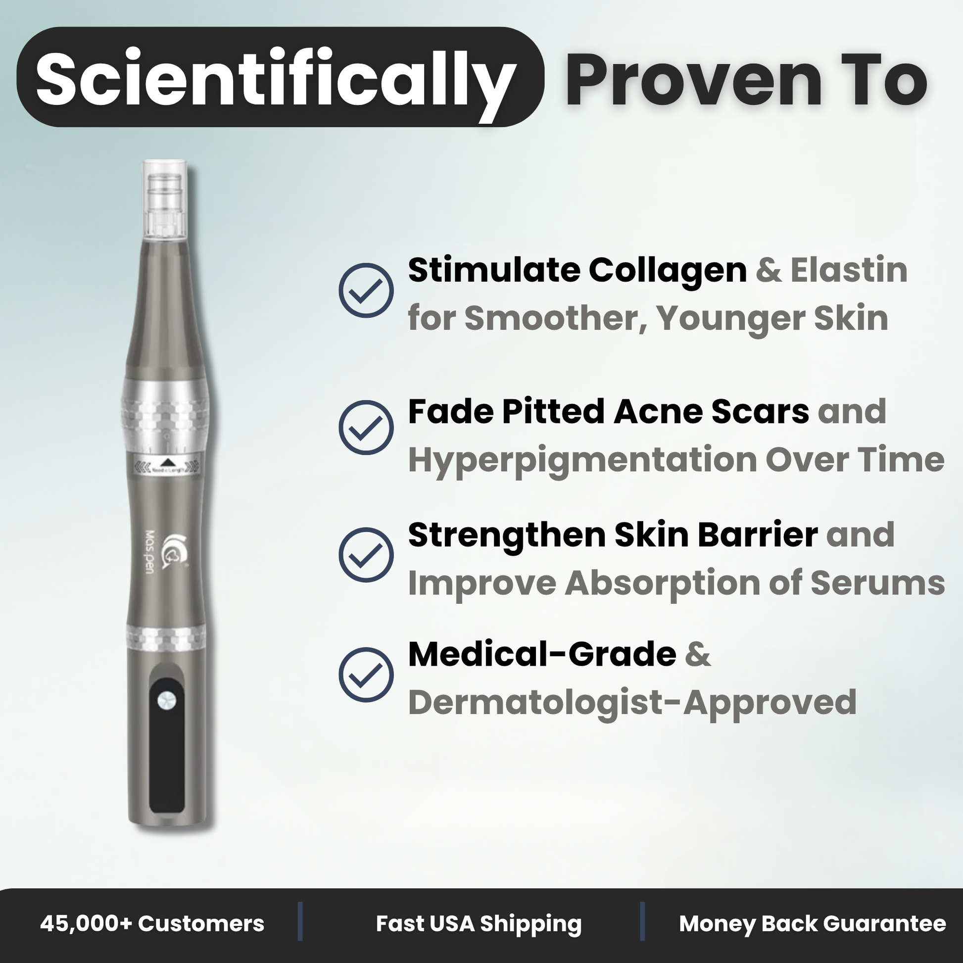 The microneedling pen creates tiny, controlled micro-channels in your skin using ultra-fine needles. This triggers your body’s natural healing response — boosting collagen and elastin production.